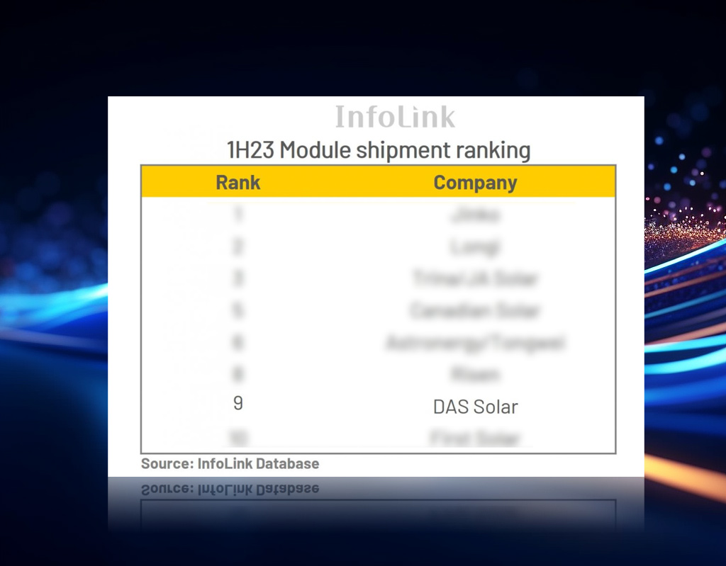 As one of Tier 1 PV manufacturer, DAS Solar has been listed in InfoLink's "2023 Top 10 module shipments" in the H1 2023 and ranked ninth.