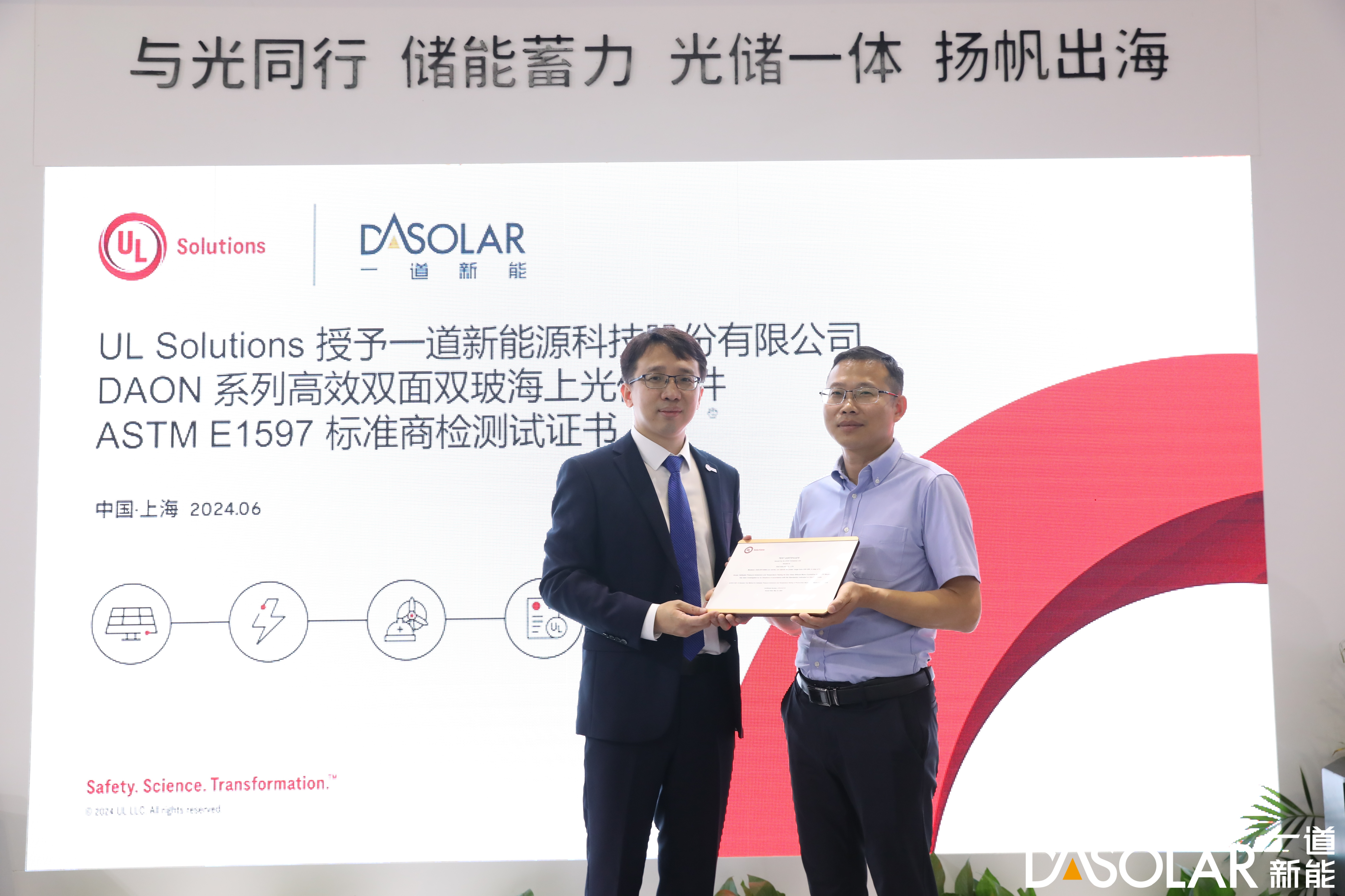 Additionally, the DAS Solar N-type high-efficiency bifacial dual-glass offshore photovoltaic module was awarded the ASTM E1597 Standard Test certificate by UL Solutions at the exhibition. There are numerous harsh environmental challenges associated with offshore photovoltaic development, including high salt spray, high humidity, corrosion, powerful waves, and marine organisms. DAS Solar developed the N-type series of offshore photovoltaic products based on its extensive technical expertise and product innovation. A number of key components have been modified and upgraded in this series, including glass, coating solution, frame material, junction boxes, and connectors, resulting in high power generation, superior weather resistance, and excellent reliability, all of which can withstand harsh marine environments.