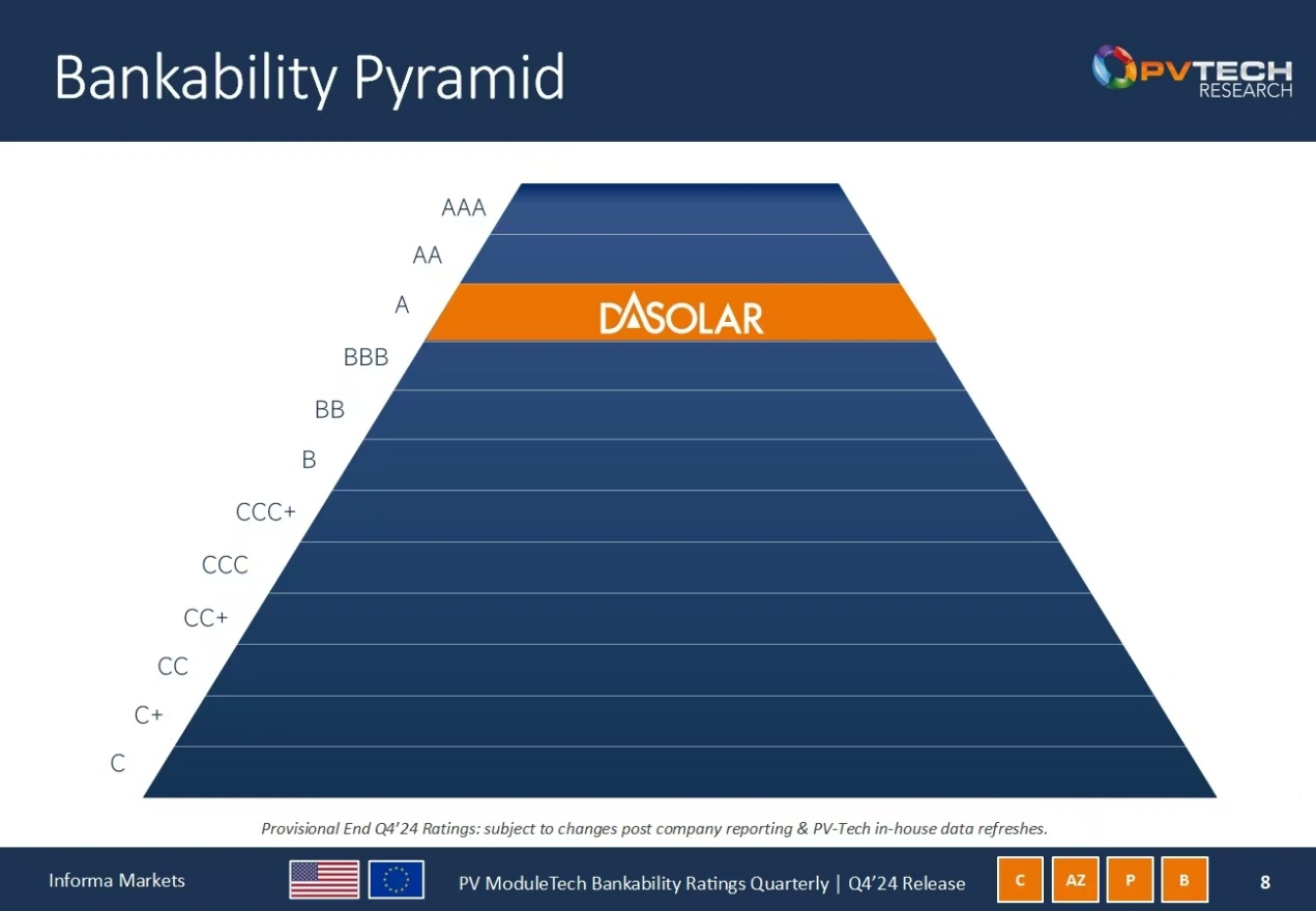 Quzhou, Feb. 7, 2025 - PV Tech recently released the PV ModuleTech Bankability Ratings report for Q4 2024, in which DAS Solar secured the coveted ‘A’ Rating for the consecutive term. This achievement underscores the company’s exceptional product quality, robust financial performance, and sustainable operation philosophy, reinforcing its leading position in the global renewable energy market.