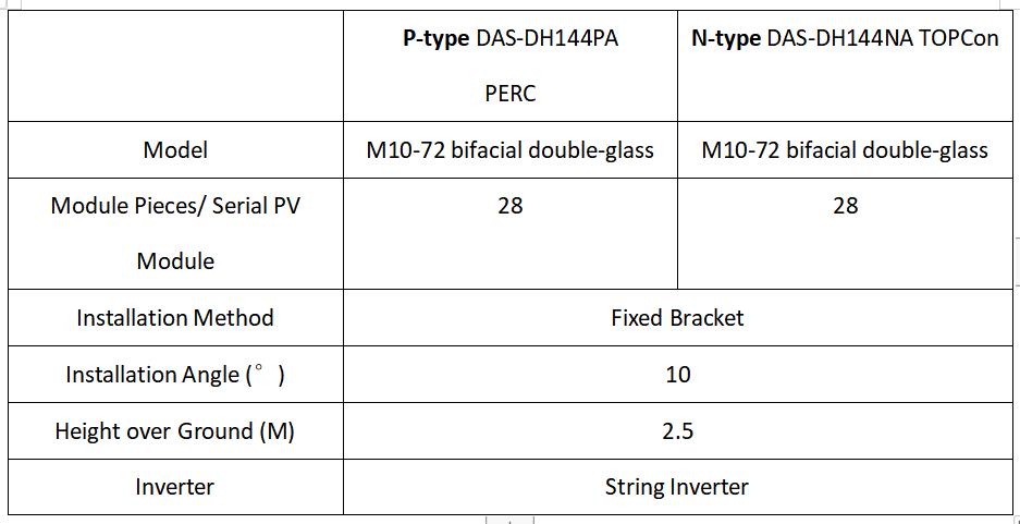 Hainan province has a tropical monsoon climate, with an average annual temperature of 24 ℃ and an average annual rainfall of around 1400mm. Hainan province boasts abundant sunlight resources, with an annual total solar irradiation of approximately 1500 kWh/m². These conditions offer favorable prerequisites for the construction of PV projects. The project has an approximate DC-side installed capacity of 100 MW. It incorporates DAS Solar's bifacial double-glass N-type modules and P-type modules, both designed with 28 cells in a series configuration. Each group has 17-18 serial PV modules and connected to a 196 kW string inverter, and a total of 16 inverters are linked to a 3.15 MW capacity transformer. The following is the corresponding power generation data from the same string and power design installation comparison.