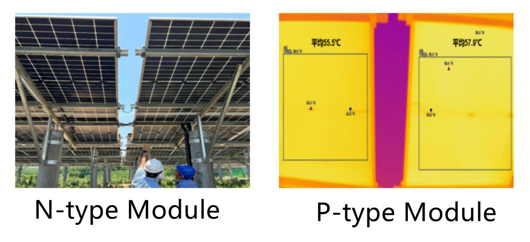 The power generation of the modules is correlated with temperature coefficients and operating temperatures. N-type modules have a temperature coefficient of -0.30% /℃, while P-type modules have a temperature coefficient of -0.34%/℃. When comparing the N-type and P-type, the temperature coefficient of N-type modules is 11.76% lower than that of P-type modules. This lower coefficient provides N-type modules with a more pronounced advantage in high-temperature conditions during the summer when module operating temperatures are elevated. Measured data indicates that neighboring N-type modules have an average operating temperature of approximately 2 ℃ lower than P-type modules. N-type has higher conversion efficiency and can convert sunlight into electrical energy. The portion of sunlight converted into heat is reduced, leading to lower module operating temperatures and mitigating power generation losses.