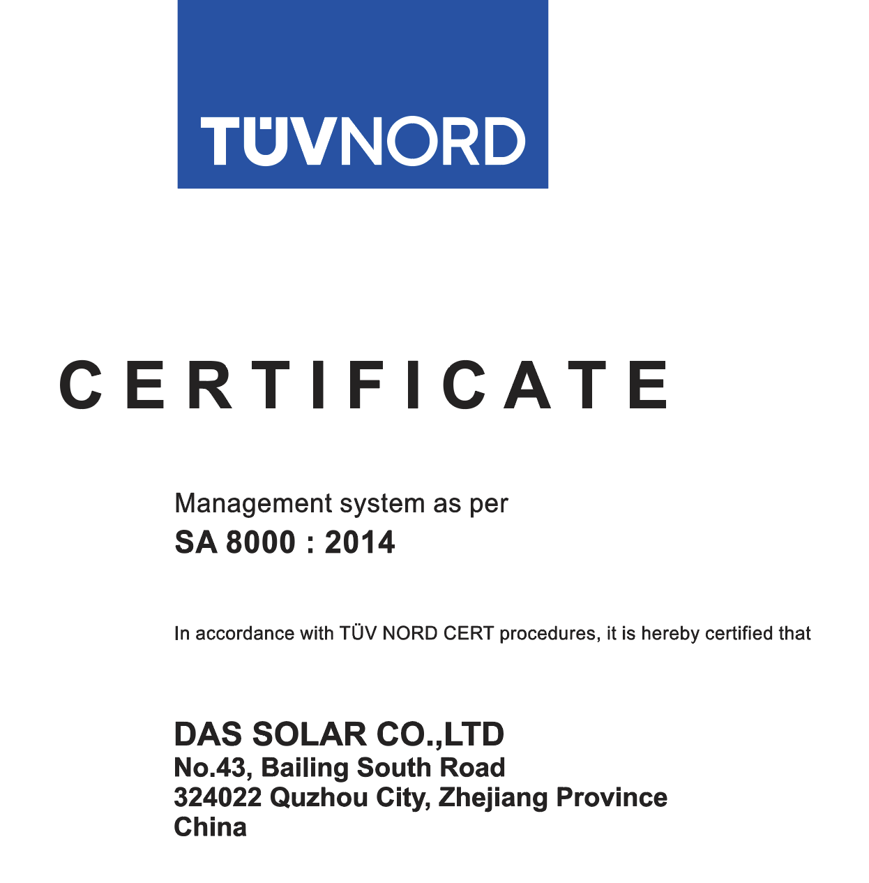 Recently, DAS Solar obtained the SA8000:2014 social responsibility certification (SA8000) by TÜV NORD GROUP, which is verified by SAI.