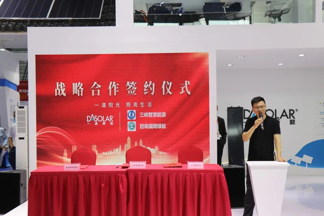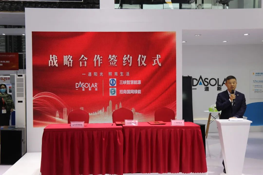当天上午一道新能源科技(衢州)有限公司(简称“一道新能”)与招商国网绿色能源科技有限责任公司(简称“招商国网”)和三峡智慧能源投资(海南)有限公司(简称“三峡智慧能源”)在一道新能展台N2-370举行战略合作伙伴签约仪式。一道新能董事长刘勇先生、招商国网总经理祝国胜先生、三峡智慧能源总经理刘安家先生作为签约人出席本次活动,招商局创新投资总经理吕克俭先生、招商国网董事长吴新华先生、 三峡资本董事长金才玖先生、三峡鑫泰总经理许汉明先生、一道新能董事施思女士见证了三方战略合作签约。
