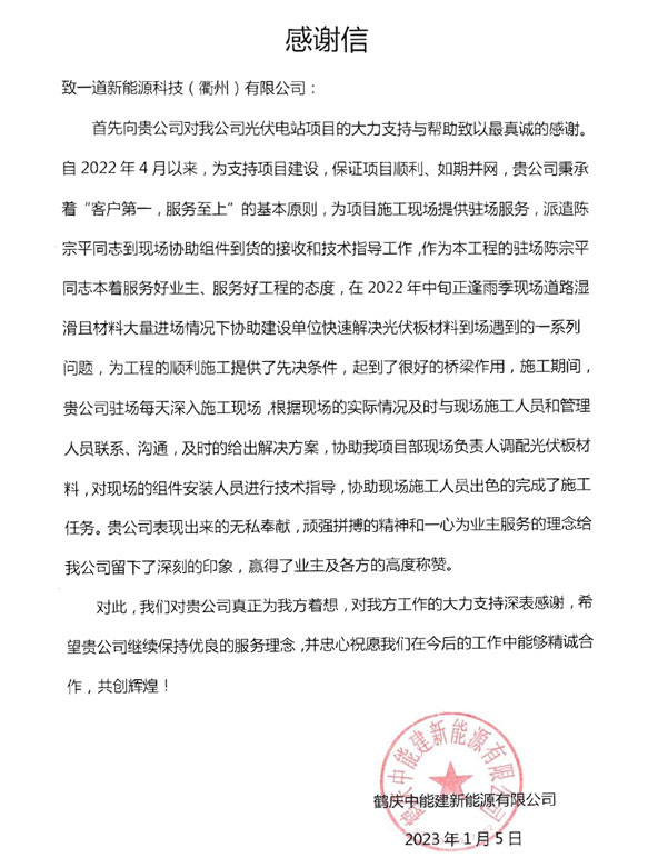 作为光伏行业的新一线品牌,一道新能自2018年成立以来迅速崛起,凭借业内领先的技术优势,优质高效的组件产品,稳定可靠的产能保障,零距离的客户服务,收获了来自众多客户的良好口碑。2019年,一道新能率先布局,在N型技术领域深耕不辍,目前N型TOPCon电池实验室效率超26%,电池量产效率超25.2%,组件量产最高效率超22.8%,持续领航光伏行业N型技术及产品的发展,为客户创造最优价值。至2023年底,公司将建成30GW高效电池及30GW高效组件产能,满足日益增长的客户订单需求。未来,一道新能将稳健发力,夯实全球布局,专研光伏前沿技术,助力绿色低碳可持续发展!