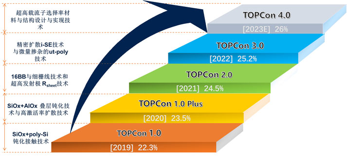 据一道新能首席技术官宋登元博士介绍,从2019年第1条TOPCon研发和生产线建立,一道新能持续加大在N型技术领域科技投入力度,持续引领N型技术发展,已经研发成功三代技术路线。此次发布的TOPCon3.0是在2.0基础上的全面升级。2.0技术是以多主栅16BB技术和超高发射极方块电阻的为技术特征,背面通过SiOx/掺杂PolySi消除金属与硅接触复合,正面通过16BB多主栅与超细金属栅线叠加超高发射极方块电阻,增强了钝化效果,大幅降低了表面的光反射,提升了太阳电池效率。