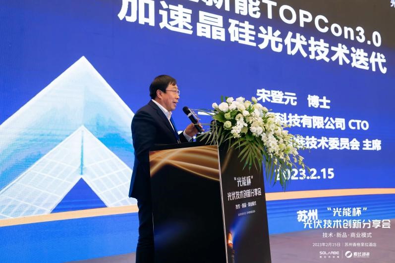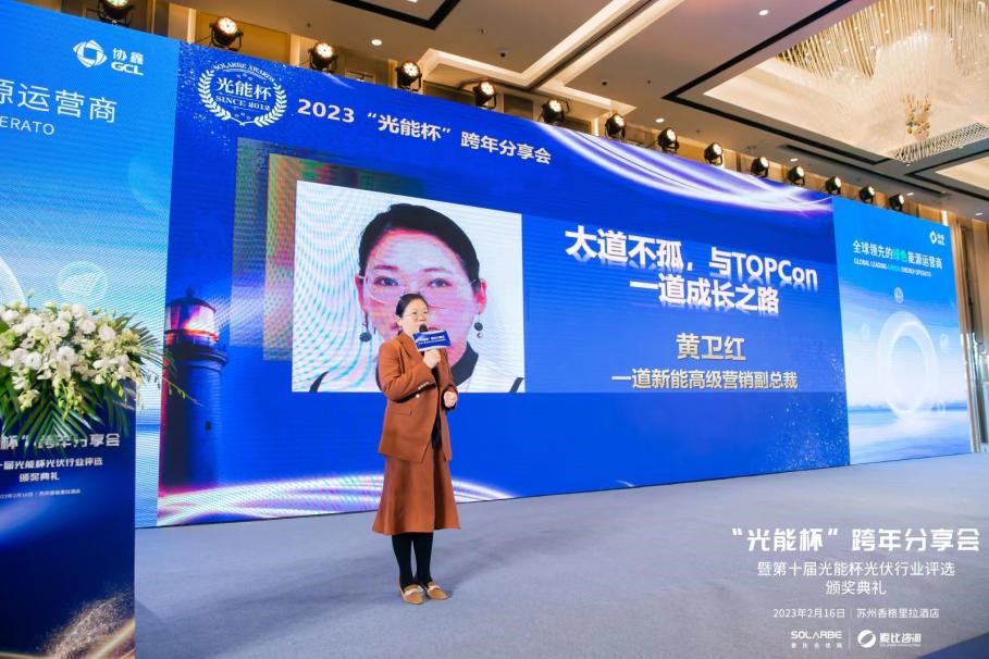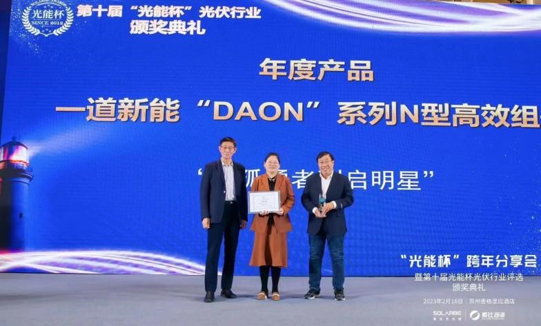 2023“光能杯”跨年分享会暨2022年第十届光伏行业颁奖盛典于2月15日-16日在苏州举行,一道新能首席技术官宋登元博士、高级营销副总裁黄卫红女士受邀参会并发表主题演讲。同时,一道新能凭借科技创新及市场开拓亮眼的成绩,一举斩获光能杯“最具影响力太阳能电池企业”、“最具影响力光伏组件企业”两项殊荣,DAON系列N型高效组件荣获“光伏行业评选2022年度产品”大奖。
