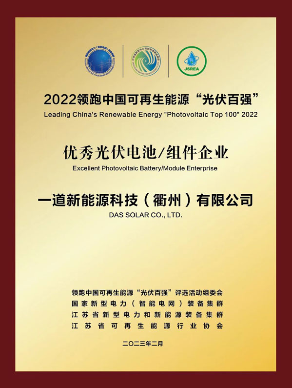 作为业内N型技术的领跑者,一道新能从成立之初就率先布局N型领域,2019年建立了第一条N型TOPCon研发和生产线,持续深耕,不断创新,目前大规模量产TOPCon 3.0电池平均效率达到25.2%以上,最高量产效率达到25.6%,持续引领光伏行业N型技术及产品的迭代发展,实现组件端全生命周期的最优价值。此次公司荣获2022领跑中国可再生能源“光伏百强”优秀光伏电池/组件企业,CTO宋登元博士获颁“光伏卓越人物”称号,再一次实力印证了一道新能在N型技术领域的翘楚地位。至2023年底,公司将建成30GW高效电池及30GW高效组件产能,未来,一道新能将凭借领先的技术优势,全场景全流程解决方案,携手合作伙伴共同助推光伏行业高质量发展!