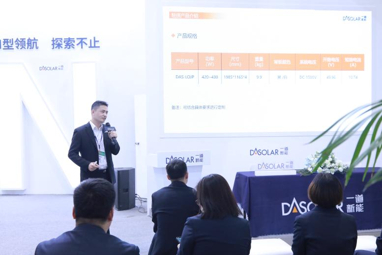 一道新能此次亮相的光伏组件展品有N型单玻DAON 585W组件、双面双玻DAON 580W组件、双面双玻DAON Pro 625W组件、P型双面双玻585W组件、430W轻质叠瓦组件。DAON全系列产品搭载TOPCon 3.0电池,电池平均效率超25.2%,最高量产效率达到25.6%,最高组件效率超22.8%,处于行业领先地位;更低的温度系数,能减少组件在户外运行时因高温带来的功率损失;更优异的低辐照性能,能提升组件在早晨、傍晚、多云等弱光条件下的系统发电量;高性能可靠,通过盐雾、耐氨、沙尘等严苛环境测试,确保电站长期可靠运行,实现组件全生命周期最优价值。