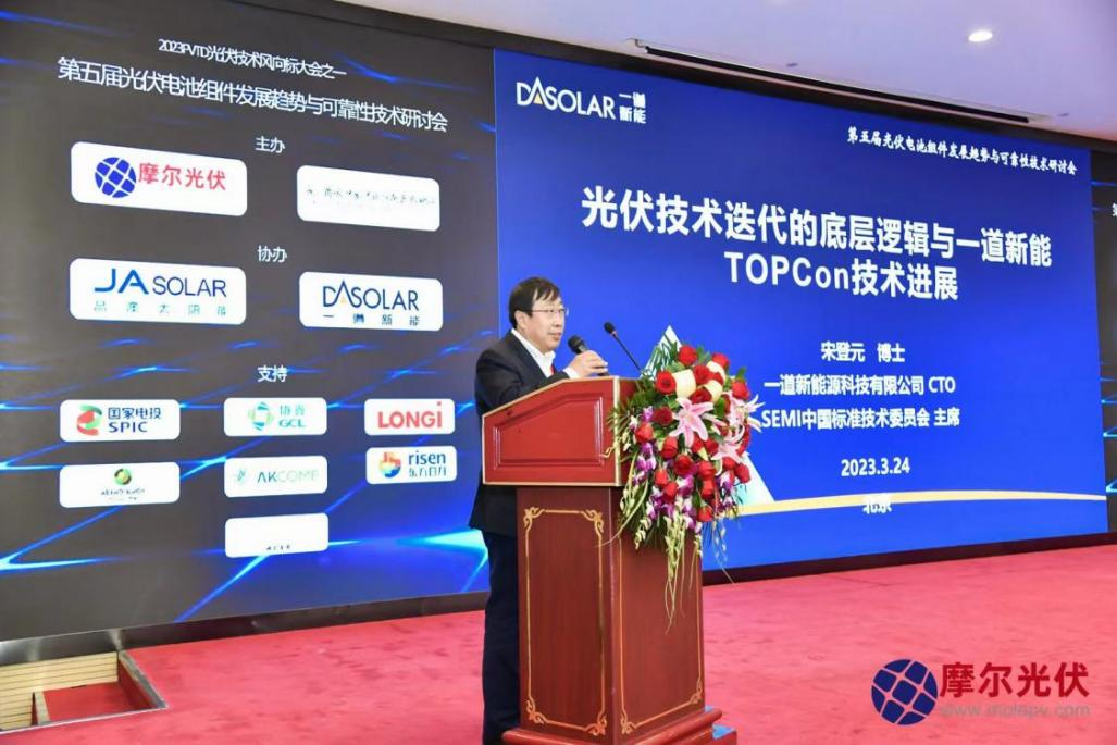 在会议演讲环节,宋登元博士受邀发表题为《光伏技术迭代的底层逻辑与一道新能TOPCon技术进展》的主题演讲,系统阐述了晶硅电池技术迭代的底层逻辑及发生技术迭代需要满足四个条件:一是新技术要有更低的平准化度电成本LCOE;二是新技术的效率远远超过上一代技术,通常新技术比上一代技术产业化效率要高1.5个百分点左右;三是新技术要具备良好的产业链生态环境,且在设备初始投资、材料及工艺过程层面要有较大的降本空间;最后新一代技术要有足够的稳定性,能稳定发电30年以上,并且在地壳中要具有足够的丰度、环境友好、能够满足TW级以上发电对材料的需求。宋登元博士表示,光伏产业具有的能源属性决定了低成本、高性价比的技术会更具生命力,晶硅电池效率的提升是以采用新钝化技术为特征,而拥有完美钝化原理及最佳载流子选择性传输的TOPCon电池技术无疑是最适合光伏产业升级的技术路线,并且随着技术的成熟、效率的提升、工艺的简化、银浆用量以及设备价格的降低,TOPCon电池技术未来竞争力会不断加强,替代PERC技术也将成为必然之势。