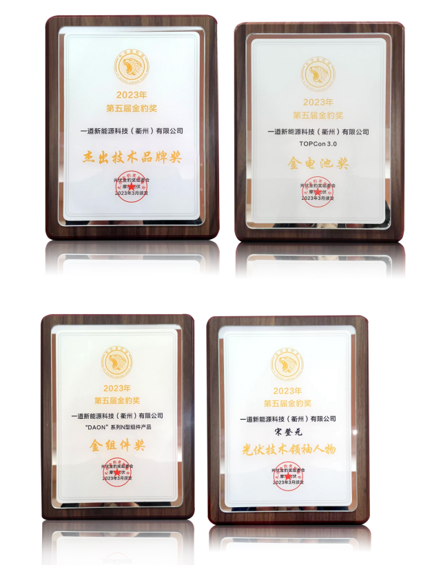 2023年3月24日,具有光伏发展风向标之称的第五届光伏电池组件发展趋势与可靠性技术研讨会暨2023摩尔光伏“金豹奖”颁奖典礼在北京举行。颁奖现场,一道新能凭借N型TOPCon3.0先进的创新技术、强劲的研发实力及过硬的N型DAON系列产品质量一举斩获“金电池奖”、“金组件奖”及“杰出技术品牌奖”三项殊荣,首席技术官宋登元博士荣获“光伏技术领袖人物”奖,以表彰他对光伏N型技术产业化发展做出的杰出贡献。