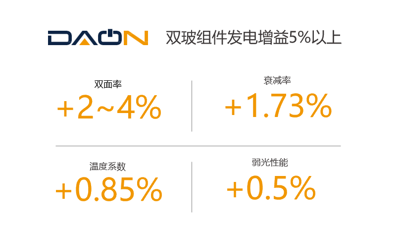光伏组件效率的不断突破离不开高效电池技术的有力支撑。此次“优加”系列推出的DAON 72片单、双玻组件,采用了一道新能自主研发的最新TOPCOn3.0技术,组件最高功率可达585W,最高转化效率可达22.8%,双面率更是高达80%。经实测数据验证,同等版型条件下,N型组件相较于P型组件发电量可增益5%以上,有效降低光伏系统的度电成本,提高光伏电站的收益率。此外,根据测试,DAON组件首年衰减不超过1%,此后每年衰减不超过0.4%,远远超过常规组件。得益于N型TOPCon电池技术的先天优势,DAON组件的效率与质量得到全面升级,更高的转换效率,更低的功率衰减、更优良的弱光反应、更低温度系数、更低隐裂风险等多重性能优势,真正实现了引领分布式光伏高效发展。