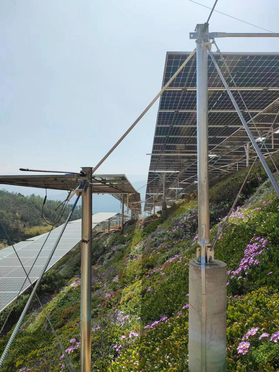 传统支架在大风状况下,容易发生扭曲、碰撞,造成光伏组件隐裂,一道新能柔性支架则采用预应力镀锌钢绞线作为组件承重索,在东西向竖向平面内通过预应力索网体系的相关设计,控制张拉应力,有效抵抗外部荷载。跨中设置排间柔性稳定抗风系统,形成双向索网结构,大幅提高抗风振性能。稳定锁杆设计改进排间柔性稳定抗风系统,通过张拉预应力,控制拉索弧垂;南北向稳定索杆系统将阵列东西南北形成整体,增加承重索的抗扭刚度,有效地抵抗风振对组件的不利影响。