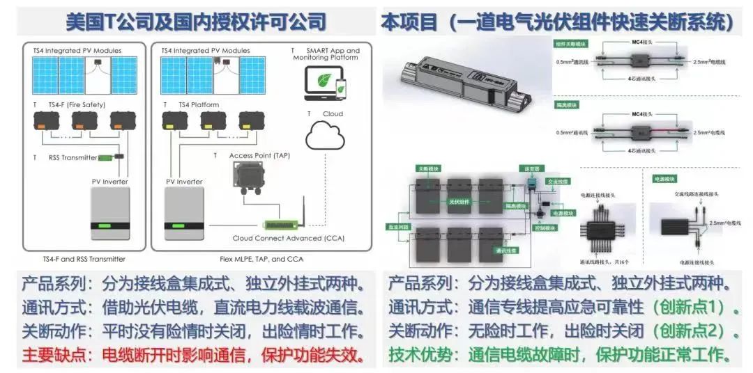 与美国T公司、国内授权许可公司的技术方案相比,一道电气光伏组件快速关断系统在通讯方式、关断动作等方式实施创新,采用通信专线提高应急可靠性,同时,将“无险情时关闭,出险情时工作”改为“无险时休眠,出险时关断”,即使通信电缆出现故障,保护功能依然正常工作。