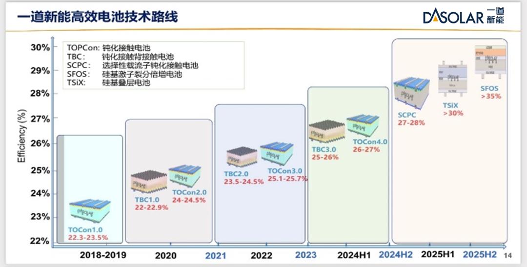 一道新能自成立之初就瞄准N型TOPCon技术方向,源于对技术发展方向的准确预判,深厚的技术积累与4年多的科研投入,一道新能TOPCon技术研发成熟与技术迭代大潮如期而至。从TOPCon 1.0发展到TOPCon 3.0 Plus技术,推动了我国光伏产业从P型PERC到N型TOPCon技术迭代的发生,目前已成为迭代PERC的主流技术。据Infolink预期,到2026年TOPCon技术占整个N型技术约80%左右。一道新能以i-SE、ut-PolySi、mt-Pass三大硬核技术为支撑的TOPCon 3.0 plus电池已经大规模量产,最高效率达到了25.8%,实验室效率突破了26.24%,730mV的开路电压创造了全球最高纪录。支撑DAON系列高效N型组件产品功率从430W-640W,覆盖了从分布式、工业屋顶到大规模地面电站应用,也支撑了沙漠光伏、城市光伏和海上光伏的18种应用场景。目前正在向 TOPCon 4.0时代迈进。