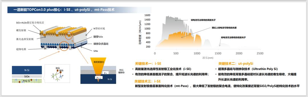 SCPC电池是基于26%效率的 TOPCon电池结构,采用新型的选择性载流子接触钝化材料,使电池的复合电流降至极限,从而提升晶硅电池的转换效率接近其理论极限。为进一步提升电池效率,TSiX电池是一种硅基新型叠层电池,使太阳光谱利用扩展到红外光领域,叠层电池能够使电池的开路电压大幅增加。目前一道新能正在与国内外多所知名大学和研究所合作,TSiX电池研发的核心技术包括,顶电池和底电池中间层的低电阻隧穿层技术,顶电池在晶硅绒面上的保角沉积技术,顶部电池和底部电池的的光谱分配技术以及金属化技术,TSiX电池产业化效率将达30%以上。