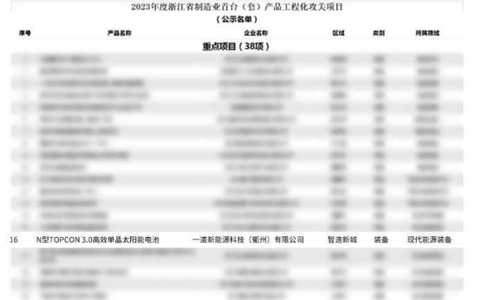 近日,浙江省经济和信息化厅发文公示“浙江省制造业首台(套)产品工程化攻关项目”名单,经初审和专家评审,共112项入选,其中重点项目38项,一般项目74项。一道新能申报的“N型TOPcon3.0高效单晶太阳能电池”凭借行业领先的技术实力、出色的自主创新和研发生产能力等多方面的突出优势,成功入选2023年度浙江省制造业首台(套)产品工程化攻关项目重点项目。
