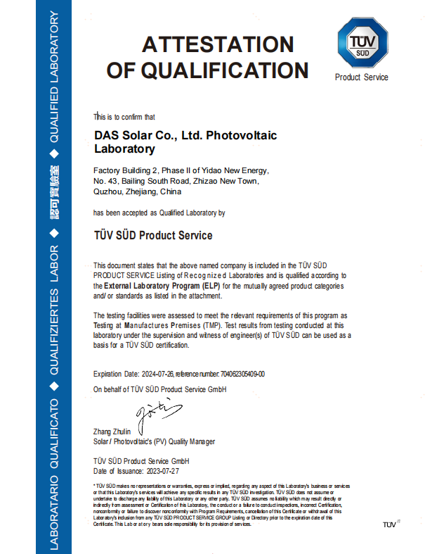 TÜV南德是全球领先的光伏电站、组件、逆变器、零部件及储能等产品认证与测试服务解决方案供应商之一,在中国光伏检测认证行业深耕数十年,具有丰富的测试及认证经验。TMP实验室是TÜV南德对光伏制造企业实验室环境、设备以及后期维护等各方面进行全面考核后提供的一种完善且全面的的认证方式。此前,一道新能光伏实验室已获得CNAS实验室认可和TÜV北德目击实验室资质,此次获得TÜV南德TMP认证,再一次彰显了一道新能在光伏解决方案产品研发和质量方面的行业领先优势。