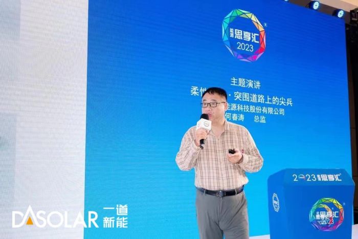 本次活动中,一道新能应用技术部总监何春涛先生受邀发表了《柔性支架——突围道路上的尖兵》主题演讲,就一道新能柔性支架的特性及应用案例展开具体介绍。