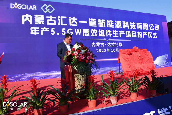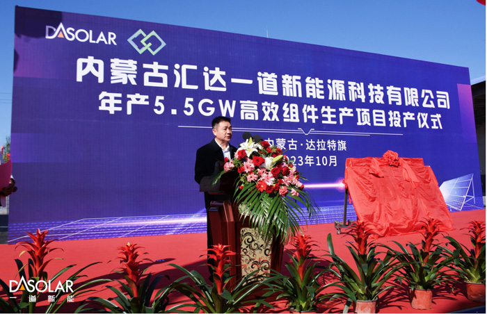 2023年10月8日,内蒙古汇达一道新能源科技有限公司(以下简称“汇达一道”)年产5.5 GW高效组件生产项目投产仪式在达拉特旗隆重举行。作为达拉特旗唯一的最先进的光伏组件制造企业,汇达一道填补了达拉特旗在光伏组件制造端的空白,开启了达拉特旗新能源产业集群集聚发展新局面。旗委书记张秀玲,旗委副书记、旗长、达拉特经济开发区党工委书记、管委会主任王小平,旗人大常委会主任杜建勇,旗政协主席刘永福,内蒙古三峡蒙能能源有限公司副总经理贝耀平,汇达能源集团有限公司董事长杨学龙,一道新能副总裁周宪彪,一道新能组件制造中心负责人马俊,汇达一道总经理闫云庆等出席仪式。