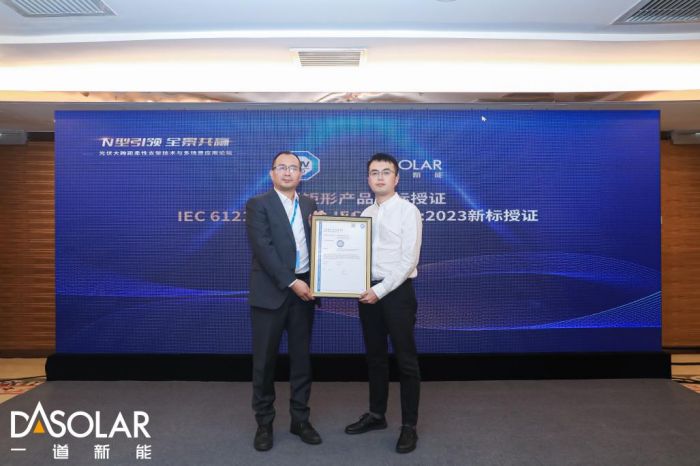 近期,一道新能联合行业多家头部企业发起光伏组件矩形产品尺寸倡议,为产业链大同共赢发展贡献一道智慧。会议现场TÜV南德意志集团智慧能源副总裁许海亮先生向一道新能质量中心总监杨虎先生颁发了N型矩形产品新标证书。新版的光伏组件IEC61215和61730系列标准对光伏组件评价规定了更严苛的要求,一道新能作为全球领先的N型TOPCon领军企业,始终以高于标准的技术要求去研发、检测、生产光伏组件。本次一道新能N型矩形产品获得IEC新标证书,标志着一道N型产品能持续满足高性能、高安全性的国际标准。