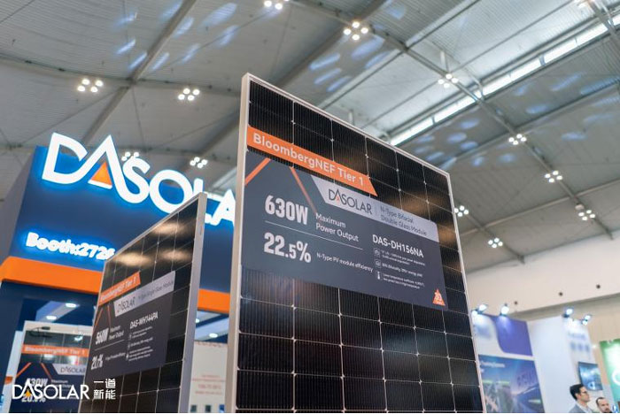 作为N型技术的领航者,一道新能凭借深厚的技术积淀和不断探索的创新精神,屡次刷新电池效率纪录,成为了行业N型技术的风向标企业。不久前,搭载“四新”特征的TOPCon4.0大面积电池(面积为333.4cm²)效率突破26.33%,再创大面积TOPCon电池效率的世界纪录,目前量产效率接近26%。此次展台展出的630W双面双玻N型高效组件实力吸睛,高效率、高功率、高双面率、低衰减等亮眼优势高能呈现,以硬核绿能为客户端创造最优价值。