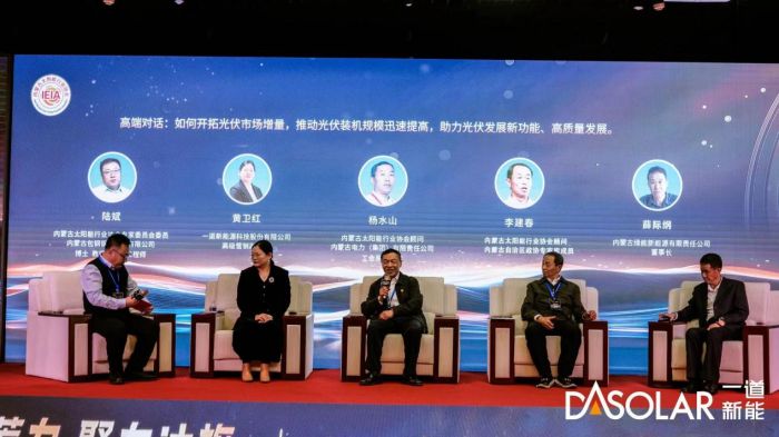 在高端对话环节,内蒙古太阳能行业协会专家委员会委员、内蒙古包钢钢联股份有限公司博士教授级高级工程师陆斌主持了本次对话,一道新能高级副总裁黄卫红女士,内蒙古太阳能行业协会顾问、内蒙古电力 (集团) 有限责任公司工会原副主席杨水山先生,内蒙古太阳能行业协会顾问、内蒙古自治区政协专家库成员李建春先生,内蒙古绿能新能源有限责任公司董事长薛际纲先生共同参与对话,对沙戈荒光伏高质量发展对内蒙古建设国家重要能源和战略在资源基地的意义、对推动内蒙古能源绿色发展的重要意义以及对内蒙古建设光伏全产业链的积极作用进行深度交流。