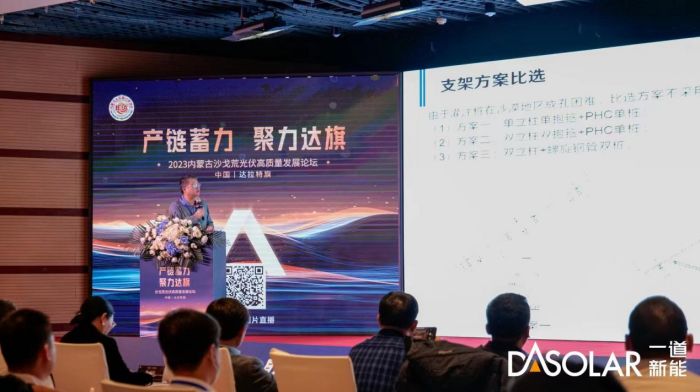 一道新能研发中心高级经理刘汪利先生向参会来宾介绍了一道新能N型技术应用沙戈荒场景解决方案。刘经理指出,沙戈荒地区高辐射量、平均日照时间长、广阔的土地空间,拥有得天独厚的光伏发展优势。然而沙戈荒地区UV辐射高、高温与温差大、砂尘多与风力大,对组件的稳定性提出更高的要求。一道新能N型组件在耐用性、弱光性、温度系数、双面率等方面具备卓越优势,能有效应对沙戈荒地区的环境挑战。