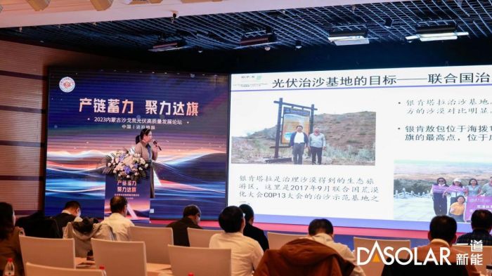 最后,一道新能高级副总裁黄卫红女士代表一道新能做开场致词。黄总表示,随着国家“双碳”目标的持续推进,近年来,内蒙光伏产业蓬勃发展。今年10月,内蒙古汇达一道新能源科技有限公司年产5.5 GW高效组件生产项目在达拉特旗正式投产,汇达一道作为达拉特旗最先进的光伏组件制造企业,填补了达拉特旗在光伏组件制造产业的空白,也开启了达拉特旗新能源产业链集群发展的新局面。未来,依托在沙戈荒项目的丰富经验,一道新能将全面助力内蒙古绿色能源的转型。