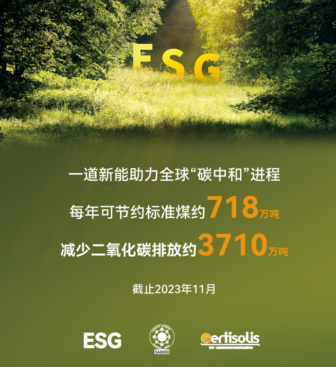 一道新能自创立之初就选择了新能源赛道,秉承初心肩负着ESG的战略发展目标,通过绿色智能制造,严控温室气体排放,生产绿色产品输出绿色电力。在相对耗能较高的工厂屋顶,铺设光伏组件,以绿色电力用于生产制造。在提升传统能源能效使用的同时,加强全过程节能管理,全面提高综合利用效率,降低能源消耗总量。公司先后取得Achilles管理平台、法国碳足迹ECS、意大利EPD认证,并获得PV Tech 2023年最佳ESG表现光伏公司,夯实了ESG建设的发展之路。