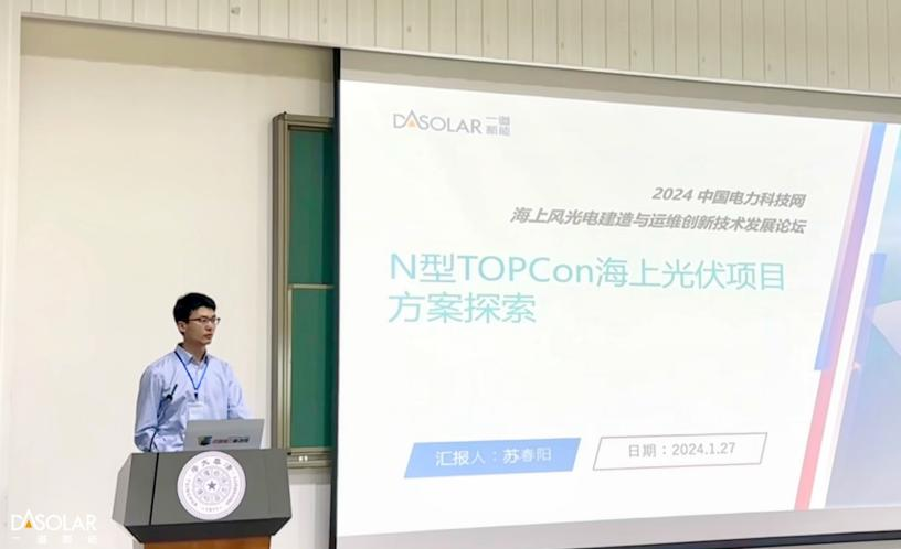 2024年1月27日,由中国电力科技网主办,中国能源研究会海洋能源专业委员会协办的“海上风光电建造与运维创新技术发展论坛”在清华三亚国际论坛隆重召开。一道新能组件研发中心经理苏春阳先生受邀出席并作《N型TOPCon海上光伏项目方案探索》专题报告,对海上光伏主材研发进行深入探讨,详细解析海上实证电站系统方案。