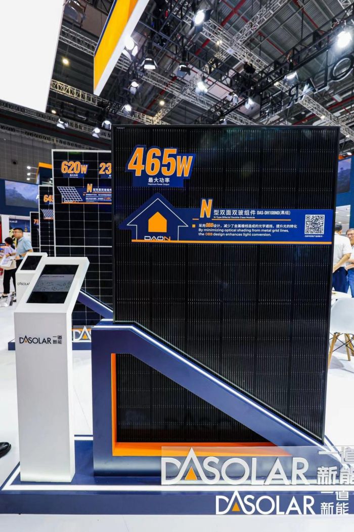 此次展会,一道新能展出了搭载TOPCon 4.0 Plus技术的182*210矩形电池片的DAON系列高功率组件。矩形硅片是方形硅片的延伸,尺寸的统一促进了行业的健康发展。210矩形片作为此前191.6尺寸的升级版,搭载该尺寸电池片的组件包含DAON系列66版型,组件功率高达600W以上,为一道新能高功率组件再添硬核产品。