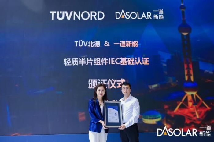 展会现场,一道新能轻质半片荣获国际权威认证机构TÜV北德颁发的IEC 新标认证证书。该认证在IEC 61215:2021标准基础上更新了对组件安全设计的要求,对组件研发、生产技术水平提出更高要求,对组件产品可靠性和安全性的评判更严格。