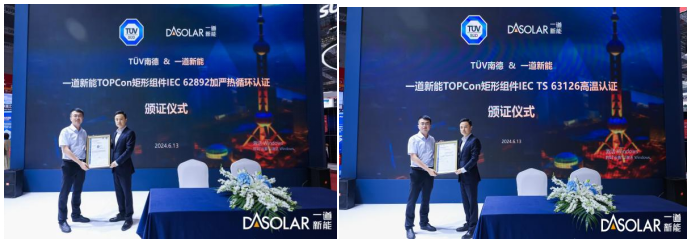 IEC 62892标准要求产品在-40℃~105℃的环境温度中,经过300次循环测试,依然能够保持稳定的工作性能。相较于常规的热循环测试标准,该测试温度更高、温差更大、时间更长、条件更为严苛,可完整评估产品长期在高温区域工作时的性能表现。IEC TS 63126标准根据不同温度等级,对组件进行紫外试验、热循环试验、干热试验、材料蠕变试验等进而分级评估,是在产品现有安全性能标准基础上进行的再升级。在该标准试验下,一道新能DAON矩形组件已通过高温Level 1等级测试。此次一道新能DAON矩形组件获颁TÜV南德的“IEC TS 63126高温认证”和“IEC 62892加严热循环认证”,进一步彰显了组件在高温、高湿、高辐射等极端条件下的稳定、高效性能。