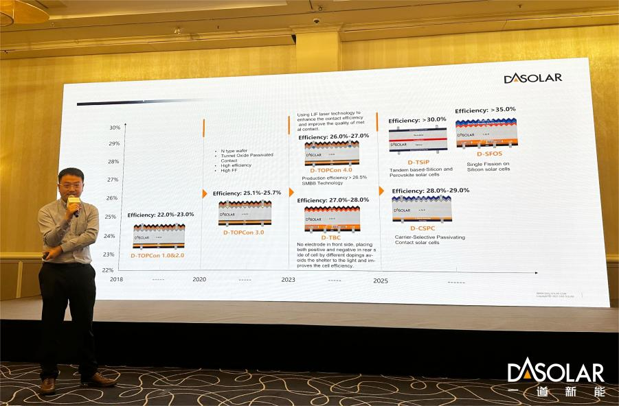 演讲环节,一道新能海外技术支持经理陈罕先生在《DAS DAON Leading N Technology》报告中分享了一道新能N型TOPCon技术产业化发展历程及成果。陈罕先生指出,一道新能坚持创新引领,连续三次打破大面积TOPCon电池世界效率纪录,量产平均效率已达到26.6%。先进技术唯有落实到产品中才能充分发挥其潜力和价值,一道新能凝结多年来在N型TOPCon电池技术领域的积淀储备,面向市场端推出DAON系列产品。陈罕先生从转换效率、双面率、弱光发电、光致衰减、工作温度、隐裂等多维度对DAON产品进行全方位解析,DAON组件具备的更高的电池转换效率、双面率、弱光性以及更低的衰减率、温度系数,可有效降低度电成本,提升项目收益,为客户提供更优的产品选择。