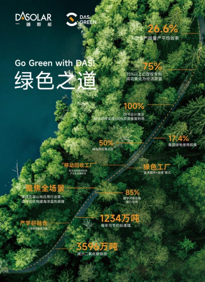 向绿而行,一道新能以坚定的零碳信念一路前行,先后取得了法国碳足迹、EPD认证,入选中国工信部绿色供应链管理企业,在绿色生产、管理、物流、包装、回收等产品全生命周期实现低碳可持续发展。截至2023年底,一道新能每年可减少标准煤约1234万吨,共计减少二氧化碳排放约3596万吨,在工厂集约化、原料无害化、生产清洁化、废物资源化、能源低碳化的目标征程上勇毅争先。未来,一道新能仍将以科技领先为内核,以绿色发展为方针,以夯实ESG进程为目标,提升资源利用效率,携手上下游合作伙伴,为光伏高质量发展贡献力量。