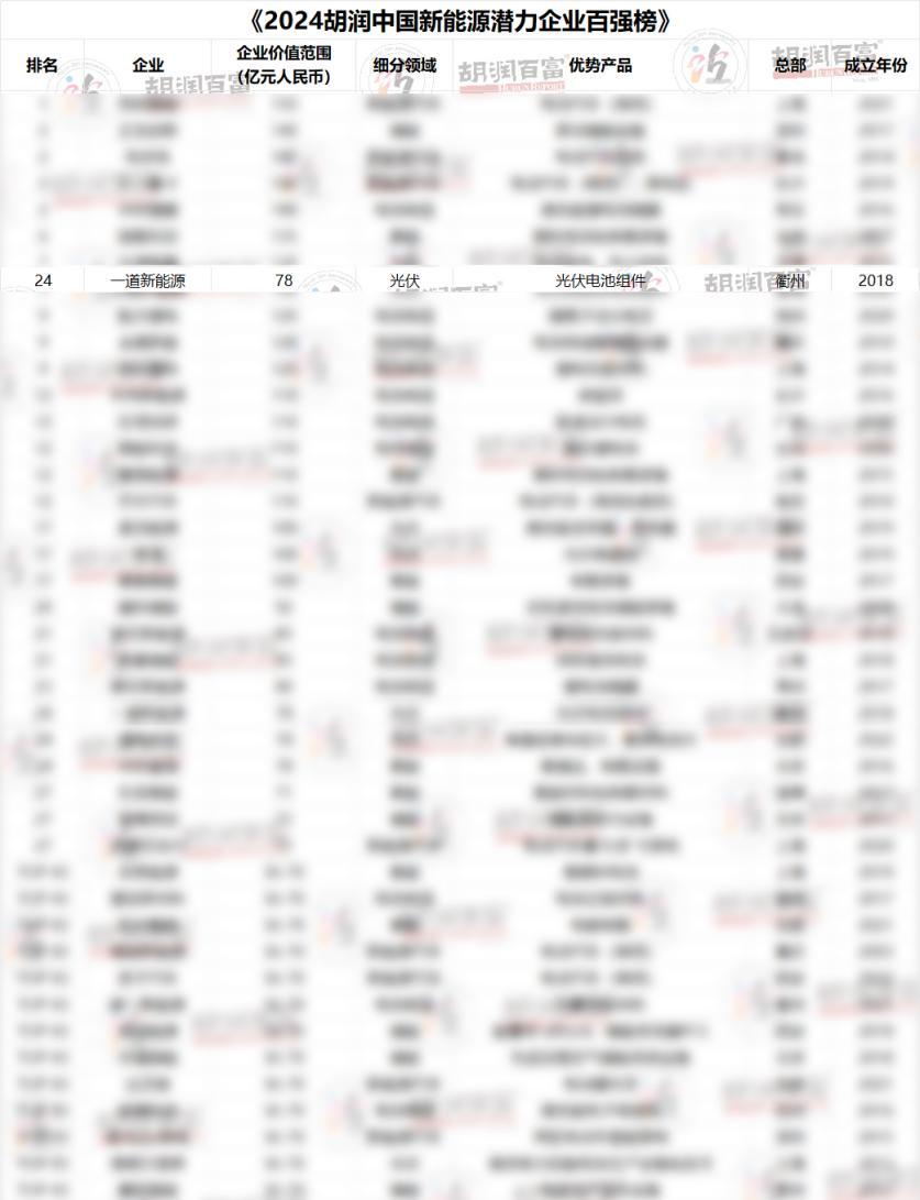 日前,胡润研究院发布《2024胡润中国新能源潜力企业百强榜》(Hurun China Renewable Energy Companies with Potential 2024)。该榜单综合了财务数据、品牌强度、消费者行为分析、品牌竞争分析以及对企业未来收入的预测,经过层层筛选和严格审核,凭借在光伏领域强劲的综合实力,一道新能成功上榜,位列百强榜单第24名。