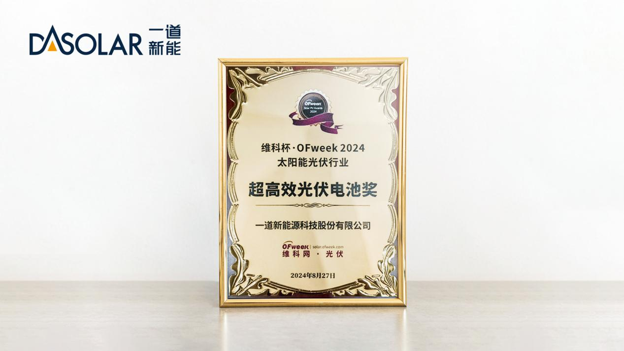8月27日,维科杯·OFweek 2024太阳能光伏行业年度评选颁奖典礼在深圳福田会展中心举办,一道新能凭借其在N型电池领域的突出成就与广泛的行业认可,荣获“维科杯·OFweek 2024超高效光伏电池奖”,再次彰显了其在光伏技术领域的领先地位。