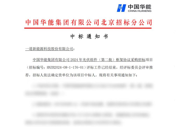 近日,中国华能集团有限公司公布2024年光伏组件(第二批)框架协议采购招标项目的中标结果,一道新能凭借其卓越的技术实力和市场竞争力再传捷报,成功入围13.5GW N型、双面双玻标段。此次中标不仅是对一道新能在N型光伏技术领域持续创新能力的认可,更是双方深化绿色能源合作、共同推动全球能源转型的又一重要里程碑。