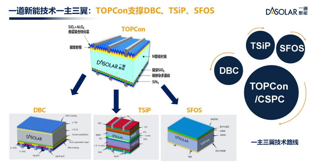 宋博士表示,一道新能前瞻性布局的“一主三翼”全景技术路线,发挥N型TOPCon技术的内核平台优势,以TOPCon作为平台技术支撑,发展DBC、TSiP、SFOS等多种技术路线齐头并进,均已取得预期的创新成果。以TOPCon电池结构制作在背面形成的DBC电池结构,已经发展了三代,并给出了第四代技术的路径,目前批量电池效率达到了26.7%;TOPCon作为叠层电池的底电池,与钙钛矿技术等相结合形成的钙钛矿/Si叠层电池(TSiP)目前效率达到33.2%;TOPCon作为单线态激子裂分层的底电池,将形成超40%效率SFOS电池技术,在追求效率极限之路上持续精进,为产品全生命周期内的最优价值保驾护航,为光伏产业打造新质生产力奠定坚实堡垒。