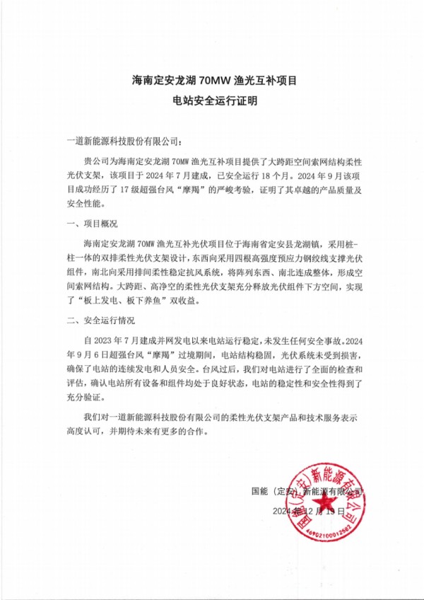 在南京航空航天大学严苛的风洞试验测试中,一道新能柔性支架在面对46m/s(14级风的风速上限)的测试风速时,未出现风致振动引起的扭转失稳,以科学合理的结构设计理念通过了严格的研发测试验证。其中,一道新能柔性支架在海南定安项目中表现尤为突出,在今年17级强台风“摩羯”过境后,据当地媒体相关报道,部分分布式电站及系统设备遭受了不同程度的损毁,令业主方承受了数千万的经济损失。而使用了一道新能柔性支架的海南定安项目,在先后历经“摩羯”、“泰利”、“小犬”等多次强台风的洗礼后,依然岿然稳固,并通过了TÜV莱茵的EL隐裂检测,展现了优异卓越的产品性能,得到了业主国能集团及总包方红太阳新能源的高度肯定。