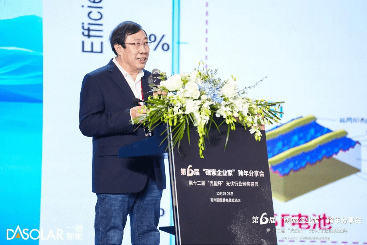 2024年12月26日,第六届“碳索企业家”跨年分享会暨第十二届“光能杯”光伏行业颁奖盛典在苏州隆重举办。这是一场汇聚了光伏行业精英、领军企业家、专家及众多创新先锋的年度盛会。本次活动由碳索·光伏与索比·光伏联合主办,旨在回顾过2024年光伏行业的辉煌成就,展望未来发展趋势。一道新能CTO、SEMI中国标准技术委员会主席宋登元博士受邀出席。面对光伏技术的百花齐放,一道新能作为光伏行业的黑马和N型技术的引领者,如何看待技术的迭代以及未来的提效方向和技术路线发展的逻辑是什么?为此,宋登元博士向与会者分享了三个观点:从p到n型迭代,有什么规律?N型TOPCon提效,路径在那里?一道新能5大技术路线,制定的逻辑是什么?