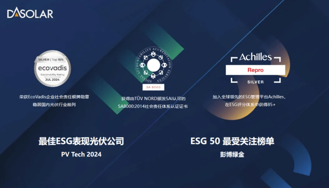 从透明高效的公司治理到节能减排的深入应用再到公益事业的责任践行,一道新能在经济、环境与社会价值创造的多轨道上高速且平稳地行驶,全方位展现出了一家优秀企业在新时代应有的担当与风采。公司先后取得Achilles管理平台、法国碳足迹ECS、意大利EPD认证,并屡次获得PV Tech最佳ESG表现光伏公司,为ESG建设的发展之路保驾护航。阳光是炽热且温暖的,是蕴含着绿色能源无限可能的力量,未来,一道新能将继续以ESG战略为核心,以人与自然和谐共生为理念,以可持续发展为目标,书写全球能源绿色转型的新篇章。