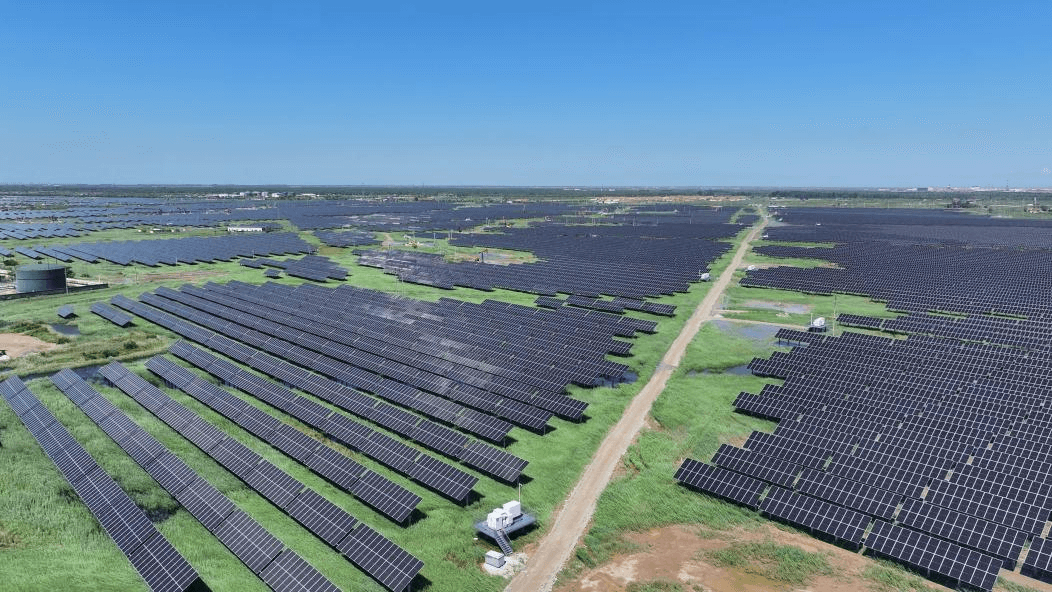 乌兰布和沙漠是中国八大沙漠之一,位于内蒙古自治区西部,黄沙广袤开阔无垠,近年来,光伏作为沙漠治理的有效途径在漫天炎黄中注入了一抹抹光伏蓝。作为内蒙古能源集团2024年第一个实现并网的新建新能源项目,该项目采用了“分块发电,集中并网”方式,采用板上发电、板间种植、板下固沙相结合的模式,实现“光伏+生态治理”一体设计、同步实施。