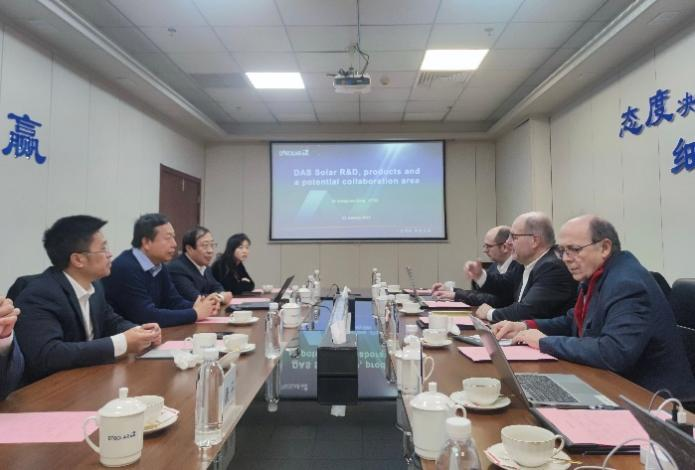 在会谈中,刘勇董事长表示一道新能高度重视国际交流合作,已先后与澳大利亚新南威尔士大学、新加坡太阳能研究院、TÜV莱茵、TÜV北德、TÜV南德等国际知名研究院所和检测机构建立了深入的合作关系。IPVF是欧洲著名的光伏研究机构,科赛院士一行的此次来访交流将促进一道新能与IPVF在先进光伏技术领域的全方位合作。宋登元博士向科赛院士一行详细介绍了一道新能的技术路线,在高效电池技术、新型组件技术以及光伏应用解决方案等领域的重点研究方向及取得的成果,双方就未来潜在的科研合作领域进行了深入讨论。