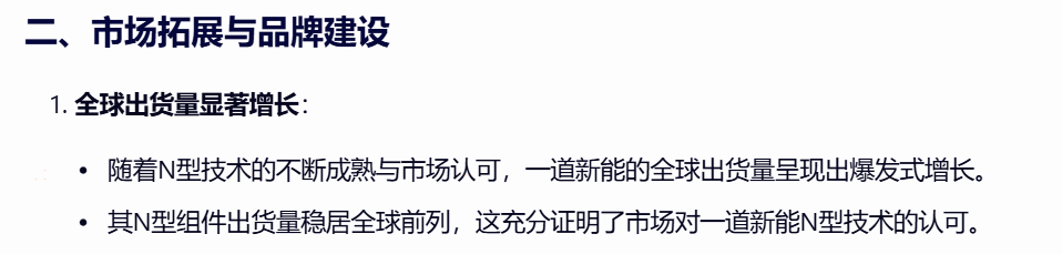 分散制造 降本增效 一道新能在N型产品的生产布局上展现出独特的优势,通过在多个地区建立生产基地的分散式制造模式,公司实现了产品的就近生产与快速发货。这一布局不仅显著降低了运输成本,还有效满足了不同地区市场的多元化需求。通过优化生产流程,一道新能成功降低了生产成本,为公司在全球市场的进一步拓展奠定了坚实基础。