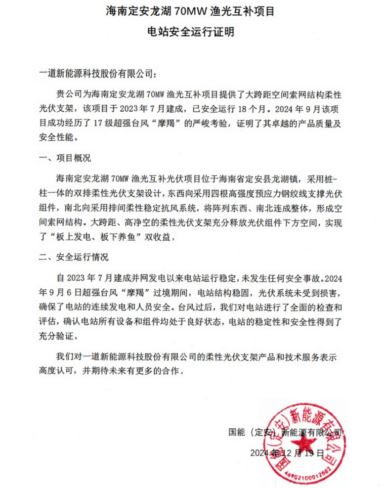 一道新能柔性支架不仅通过了南京航空航天大学的风洞测试,起振风速大于46m/s,而且还通过了新疆十三间房极端工况测试(高低温±40度,最大风力等级17级)、组件抗隐裂测试。创新性设计、优质的选材、严苛的测试打造出高性能的产品,面对极端天气,一道新能柔性支架以高安全性、高可靠性脱颖而出。值得一提的是,海南定安龙湖渔光互补光伏项目直面了17级超强台风“摩羯”洗礼(项目地距离台风路径最小距离约30公里),一道新能柔性光伏支架系统岿然稳固。台风过后,TÜV莱茵对安装在柔性支架上的光伏组件进行了严苛的现场检验,在外观、EL隐裂等项目中表现优异得到了业主方的高度肯定。