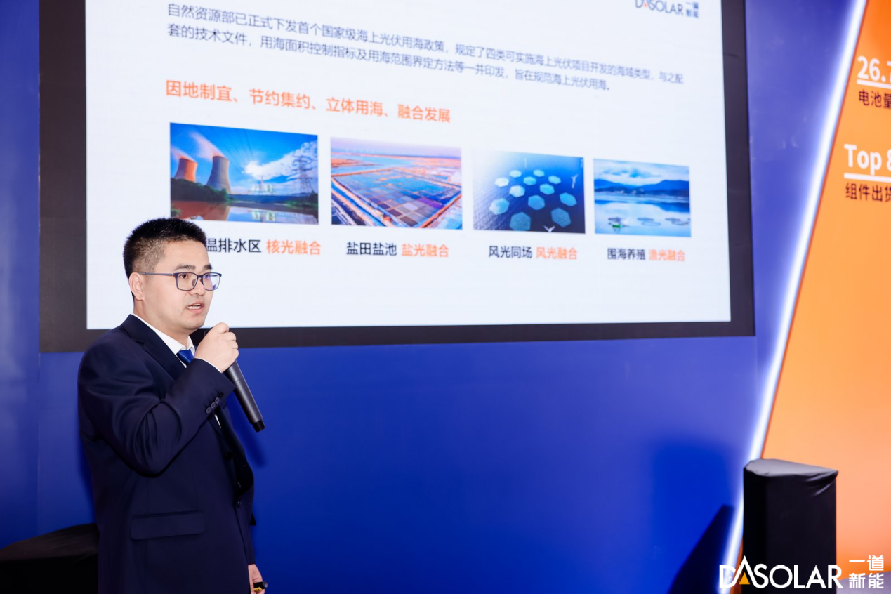 随着全球对清洁能源需求的不断增长,海上漂浮式光伏系统因其不占用陆地资源、光照资源丰富等优势,逐渐成为未来光伏发展的一个新方向。潘浙锋总监以《海上漂浮式光伏系统解决方案》为主题,详细介绍了一道新能在海上漂浮式光伏系统方面的研究和应用,他指出,一道新能凭借其强大的技术研发能力和丰富的实践经验,为这一领域提供了高效、可靠的解决方案。