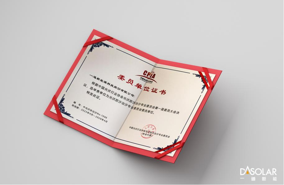 近年来,光伏治沙作在我国“三北”等沙漠区域实现了越来越广泛的应用,为我国生态环境治理注入了绿色可持续基因。一道新能柔性支架凭借着高可靠性、高安全性、高性价比的突出优势,在光伏治沙领域强势突围,为光伏项目的建设提供了更加优质、经济、高效的解决方案,目前已在多个光伏治沙项目中收获了宝贵经验。不久前,凭借在光伏治沙领域的突出表现,一道新能入选中国光伏行业协会光伏防沙治沙专业委员会并担任委员单位,应用技术部项目运营总监陈丽萍当选委员。未来,一道新能将持续发挥创新内核,以高品质打造全场景差异化解决方案,深入拓宽“光伏+”应用领域,以绿色治沙带动经济致富,为推进我国沙戈荒光伏大基地建设,开辟新型电力系统建设与能源低碳转型的重要路径,为全球荒漠化治理贡献一道智慧!