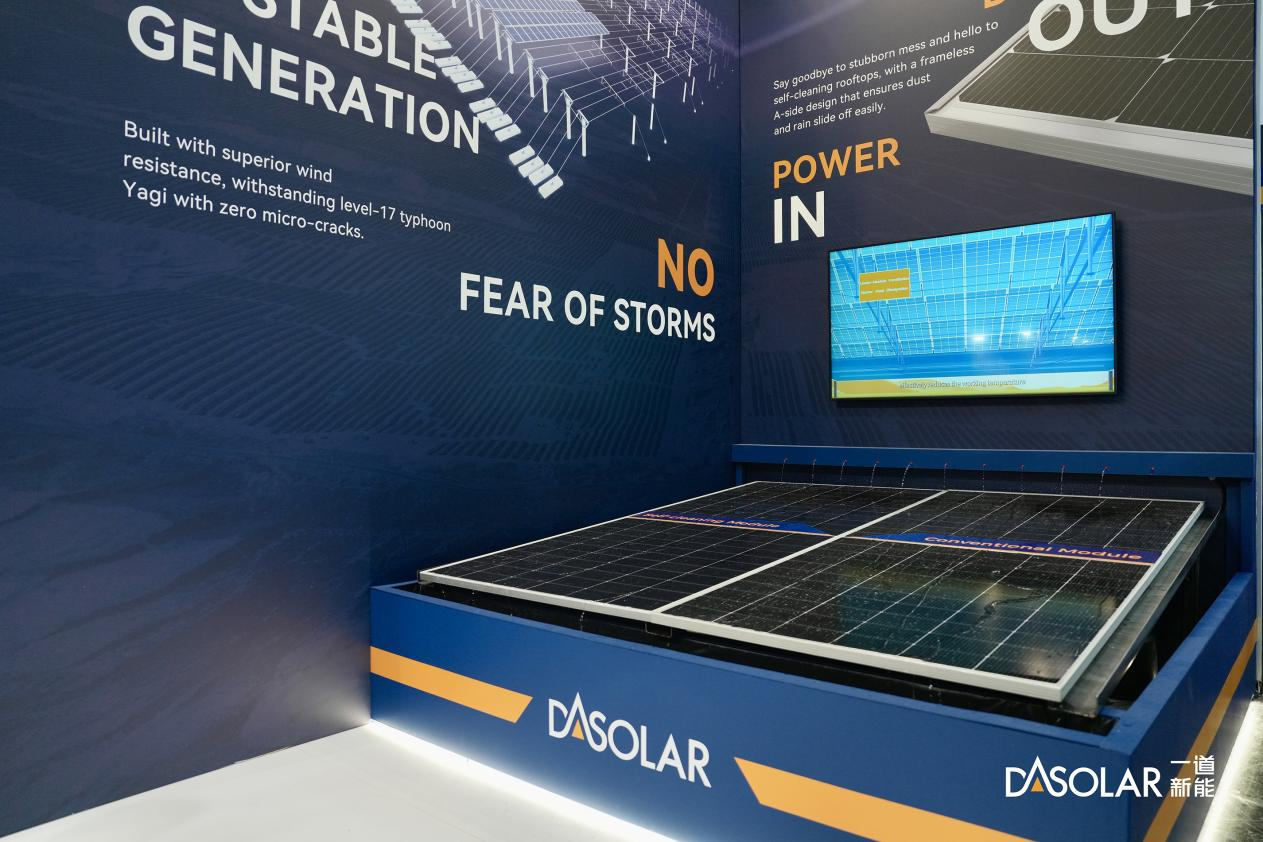 在此次展会现场,一道新能展出的产品有460W DAON全黑系列组件、630W DAON双面双玻矩形组件、470W DBC组件、500W轻质组件、630W自清洁组件等,全面突出了公司在技术创新性、产品可靠性、矩阵差异性的核心竞争力。DAON全黑系列组件产品采用黑电池、黑边框、黑背板、透明背板等客制化选定配置,适用于对外观有极致追求的高端项目。