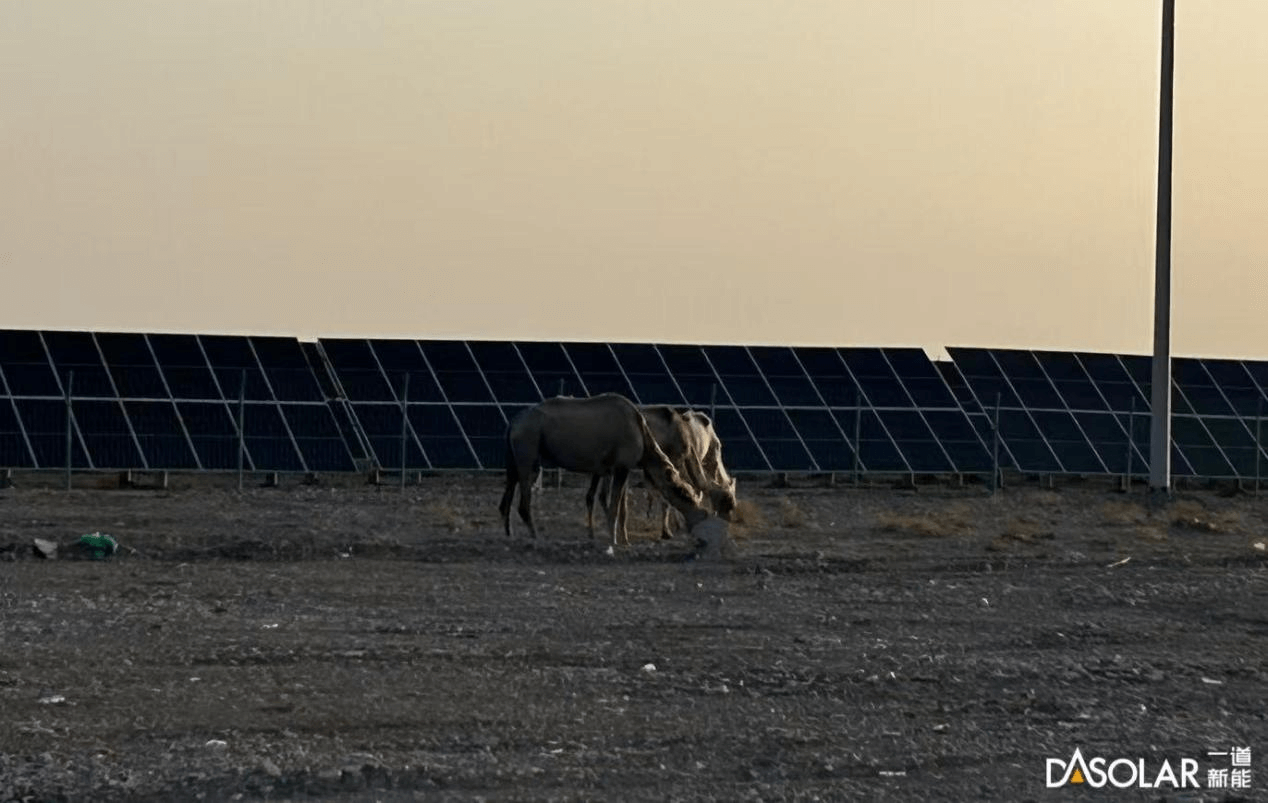 榆林的沙丘,也并非人们想象中那般荒凉。在这里,光伏人不仅追逐着阳光,更肩负着治沙的重任。寂静的清晨,光伏阵列下,滴灌培养的苜蓿林郁郁葱葱。阵列间的沙地像一块巨大的画板,记录着夜晚“巡游”者的踪迹:像竹叶般的爪印或许是野鸡留下的?梅花状的脚印说不定是狐狸的杰作。梭梭林里,沙蜥忙碌地穿梭其中,也默默守护着这片土地。在生态脆弱的区域,我们的项目采用了自主研发的柔性支架架设光伏板,这种方式无需大规模平整土地,桩基数量也大幅减少,最大程度地保留了原始地面植被,为众多生物守护了栖息地。光伏板在沙丘上静静伫立,与周围的生物共同构成了一幅和谐的生态画卷。